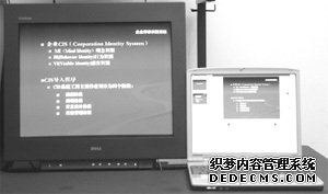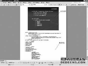 设置幻灯片的放映方式。在菜单栏中点击“幻灯片放映”,选择“设置放映方式”项,弹出“设置放映方式”窗口,在“多监视器”的“幻灯片放映显示于”中选择“监视器2 DELL P991”,是为了让幻灯片的内容在外接显示器DELL P991中放映,同时选中“显示演示者视图”,确定后设置生效。放映时的效果见图4,外接CRT只显示幻灯片,笔记本的LCD不仅显示了正在放映的幻灯片和备注页中讲稿内容,还列出了幻灯片的缩略图和一些放映工具按钮。这样就可以根据备注页提示的讲稿讲解放映的幻灯片,完全不需要翻前翻后的讲稿了,既不会遗漏讲稿的内容,又能根据图8左侧的幻灯片缩约图控制全局,还能用放映工具使演示“挥洒自如”。