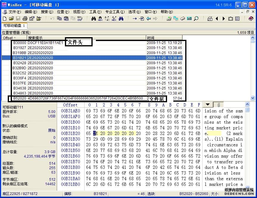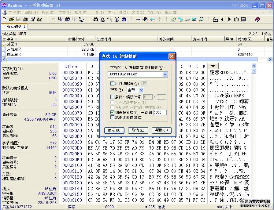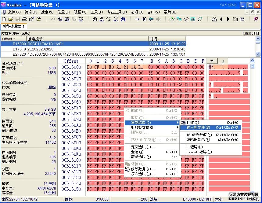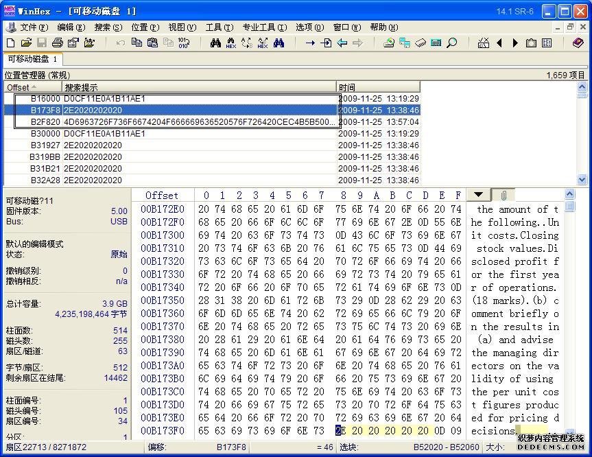 1、用WinHex打开U盘,搜索Doc文件头D0CF11E0A1B11AE1,如下图: