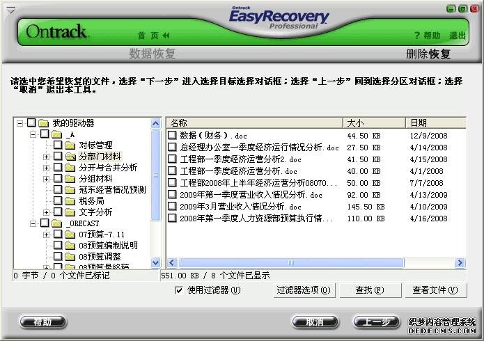 一、用EasyRecovery恢复,过滤器用“*.doc”,搜索结果如下图: