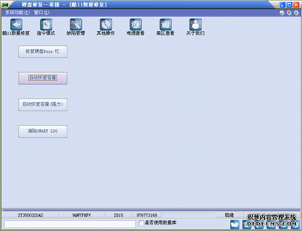 (8)将电源复位一次,可以看到硬盘可以就绪。但此时看到容量LBA依然为0,在"酷11数据修复"工作界面中单击"自动恢复容量"按钮,如图7所示。