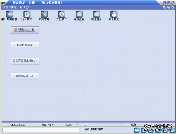 (1)将故障硬盘与维修终端及电脑连接好后,启动希捷专修程序,在打开的欢迎界面中选中"酷鱼11"单选按钮,单击"进入"按钮进入程序的"酷11数据修复"工作界面,如图1所,可以看到硬盘状态一直为"忙"。