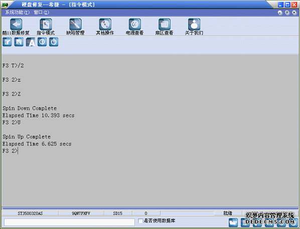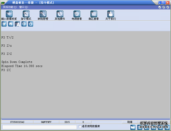 (4)切换到"指令模式"工作界面,单击"A指令"按钮,在其中输入"/2"指令回车,转换到2级模式,输入"Z"指令回车,停止电机,硬盘停转,如图4所示。