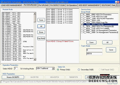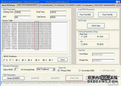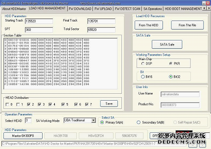 (1)将硬盘连接到迈拓修复终端上,在"LOAD HDD MANAGENT"选项卡中单击"From The HDD"按钮,在选项卡下方可以看到硬盘信息和磁头数量等,如图1所示,从图中可看到该硬盘磁头分布为从2头到7头,共6个头,主头为3头。