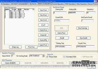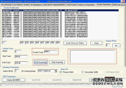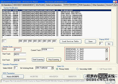 (7)在"HEAD"文本框中填写硬盘的主头,以便对其检测,由于前面检测到的坏道位置是在LBA=1705950处,所以现在检测00号区段(LBA为 0~48492335),在"Section Modification"列表框中选择00号区段,单击"Start Scanning"按钮开始扫描,如图5所示。