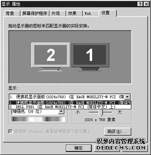 目前大多数的笔记本电脑都具有双屏显示(DualView)功能,如IBM的X21,Compaq Presario 800,Acer350系列等,也有一部分笔记本的显卡不支持双屏显示(DualView),这时笔记本的VGA接口所外接的显示器或投影仪只能与笔记本的LCD进行镜象同步,显示相同内容。笔记本是否具有双屏显示(DualView)功能,只需要打开“显示属性”对话框的“设置”项,如果出现有两个显示器图标,表明显卡支持双屏显示(DualView);如果没有两个显示器图标出现,只看到桌面的缩小图标,表示显卡不支持双屏显示(DualView)。